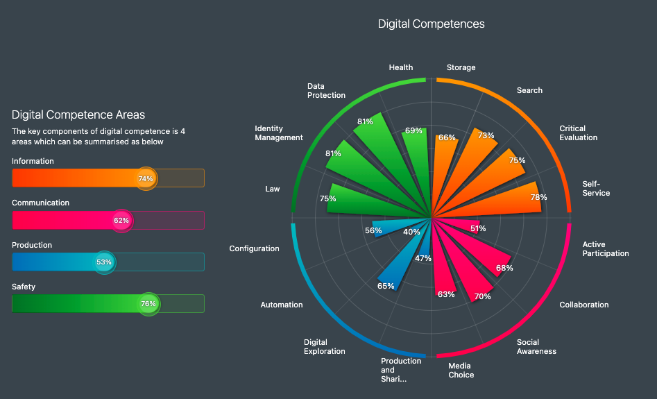 I felt that my digital competence was at a basic level but after taking a digital competence test my test results showed that my competence level is actually slightly better than average. The sections of the test where my competence level was the highest were security (76%) and information management (74%). This was a pleasant surprise as these aspects are especially important in my everyday work. On the other hand, production value was the section where I received the lowest score (53%). This did not surprise me. I do not produce digital material in my work and even in my spare time my contributions are limited to occasionally publishing images on social media. I also know that my computer skills are not the best. In my opinion, digital competence is an ongoing journey and there is always room for improvement.