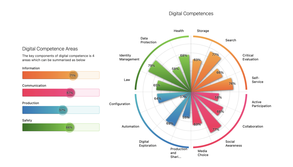 I completed the Digital Competence Test, which evaluates digital skills in 4 main areas: information, communication, production, and safety. My strongest area was information (71%), which shows that I am confident in finding, understanding, and using information online. My result in communication (67%) indicates that I can use digital tools to communicate and interact with others quite well.