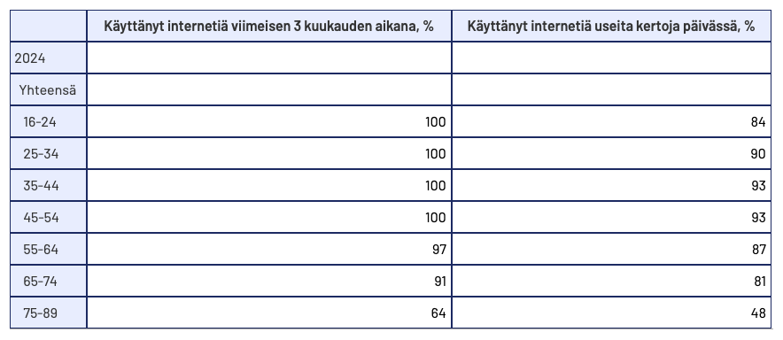 According to data from Statistics Finland (stat.fi), nearly 100% of people aged 16–64 in Finland used the internet during a three-month period in 2024, and almost 90% used it several times a day. Among those aged 65–74, 81% used the internet daily, and about half of people over 75 did the same.