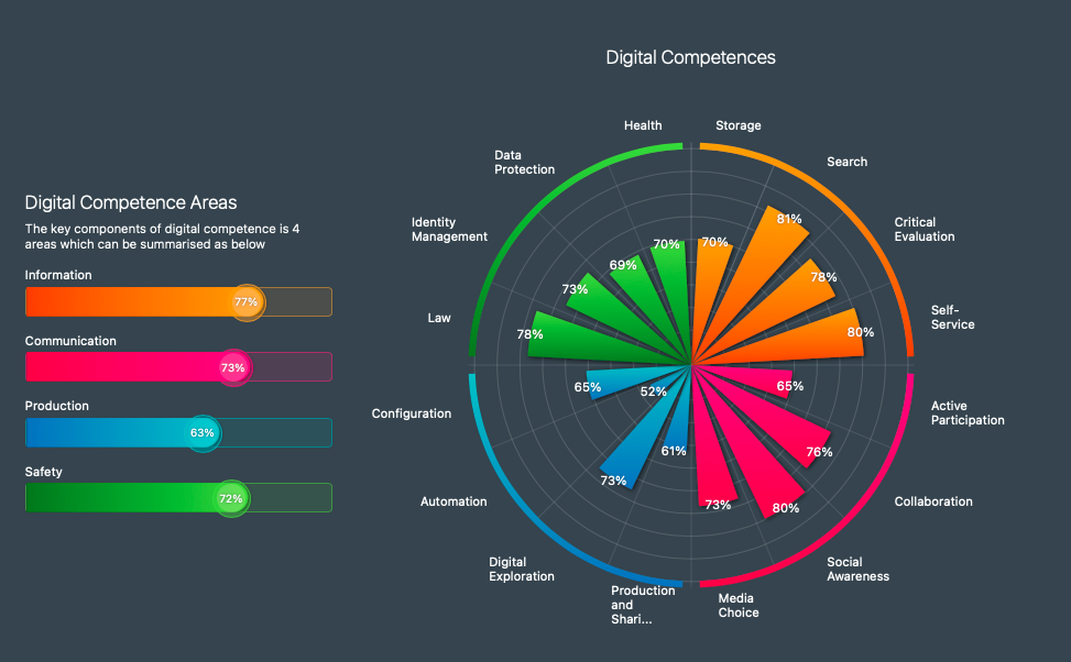 I found this test very interesting to complete, and it gave me a comprehensive picture of my own digital skills. My strongest areas were searching for information from reliable sources and reading information critically. These skills have improved significantly during my studies.