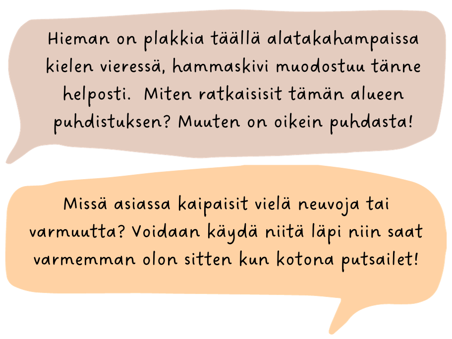 Hoitotuloksen arvioinnin yhteydessä on edelleen tärkeää, että informoit asiakasta suun puhtaustilanteesta, motivoit jatkamaan hyvää suun omahoitoa sekä kehut mahdollisista onnistumisista. Anna tarvittaessa vielä viimeiset vinkit ja tarkista, että asiakkaalla on tekniikat hallussa.