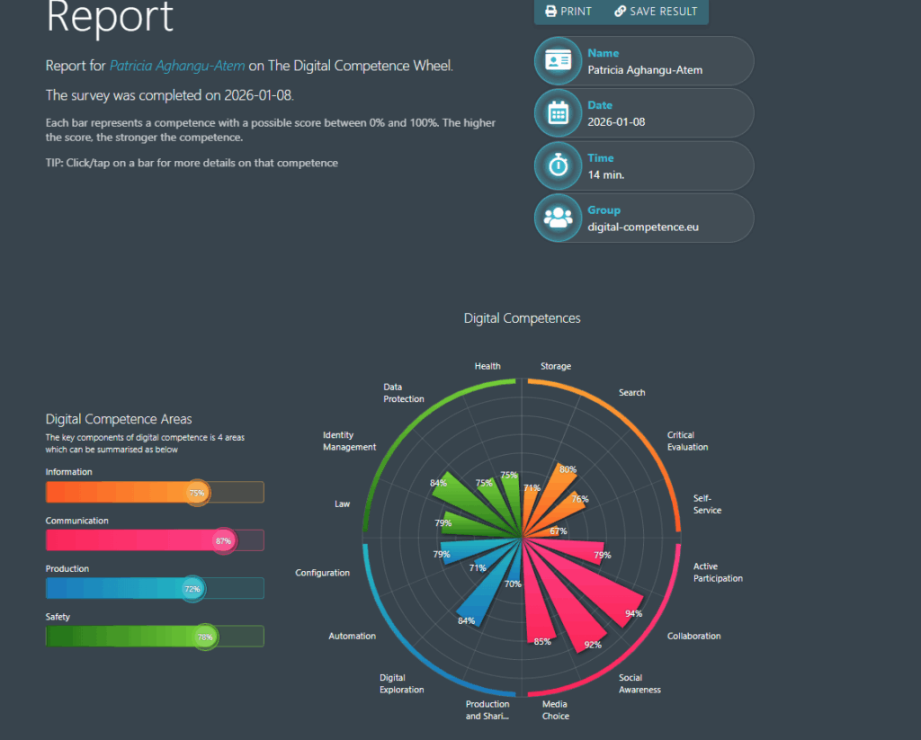 Completing the digital competence test provided a clear overview of my strengths and areas for growth in working with digital tools and environments. My results show strong capabilities in identity management (84%), collaboration (94%), social awareness (92%), media choice (85%), and digital exploration (84%), demonstrating that I can navigate complex digital contexts, protect personal information, communicate effectively, and adapt to new technologies. Areas such as self-service (67%) and production/sharing of content (70%) indicate opportunities for improvement, particularly in independently creating and using online solutions. Overall, the results reflect that I have advanced to highly specialized or advanced levels in most key areas, which aligns with my professional experience in healthcare, where critical evaluation, data protection, collaboration, and digital literacy are essential. The test also highlighted the importance of continuously developing digital skills to keep up with evolving technologies and maintain effective, safe, and professional digital practices.