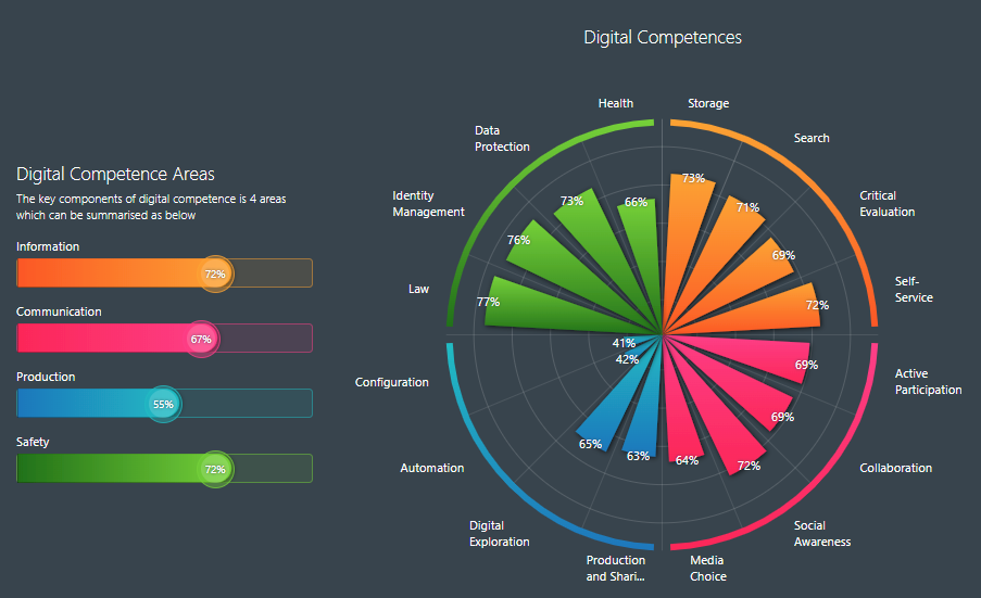 Here are the results of the digital competence test. This test was interesting and useful to complete. The results did not come as a surprise to me, as I already knew that production is challenging for me. My highest scores were information and safety areas.