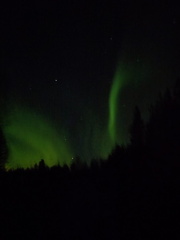Oli mukavaa tehdä ruokaa ja saunoa ystävien kesken mökissä. Koulutehtävienkään tekeminen ei tuntunut ikävältä niin upeassa ympäristössä. Paistoimme makkaraa ja vaahtokarkkeja nuotiopaikalla. Reissun paras hetki oli revontulet, joita näimme toisena iltana. Matkallamme oli mukana kaksi vierasta Costa Ricasta ja oli mahtavaa nähdä kuinka hieno kokemus se oli heille.