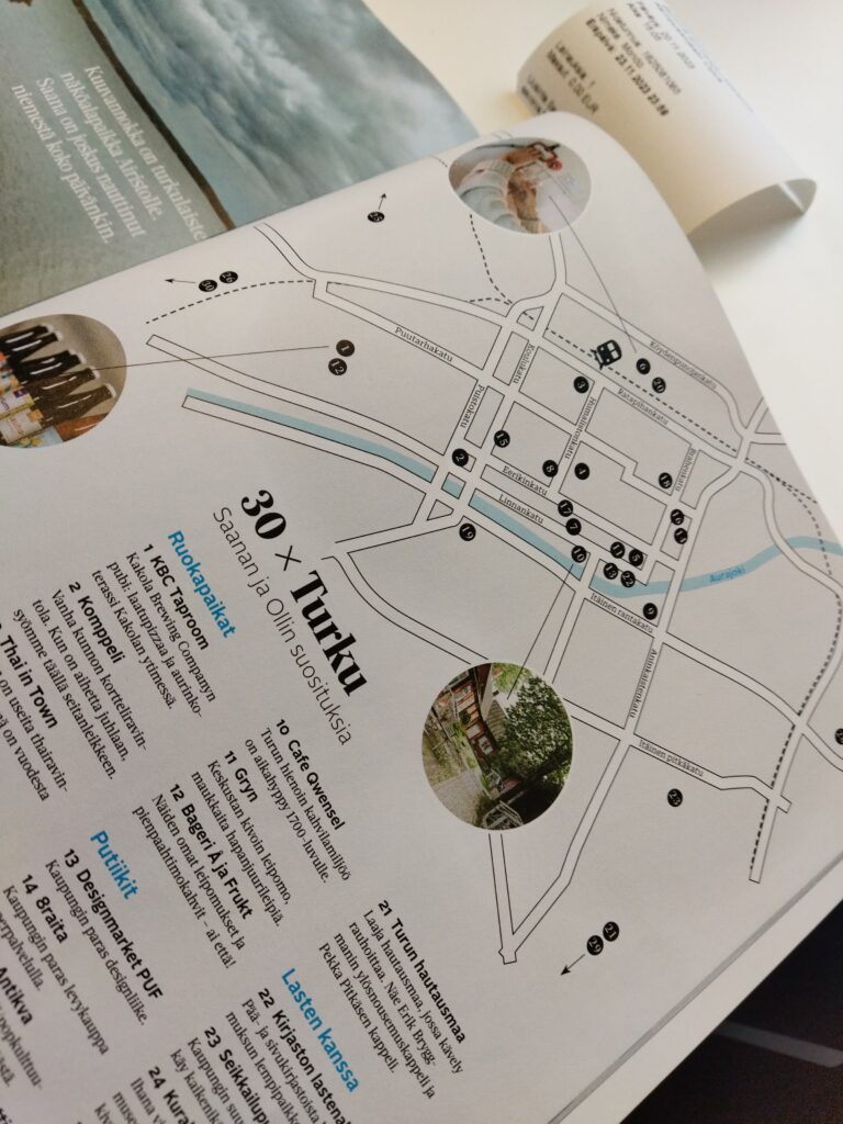 Kuva 1. Saanan ja Ollin vinkit mielenkiintoisiin paikkoihin Turun keskustassa. Kuva otettu Mondo- lehdestä 12/2023 (Kortelainen 2023).
