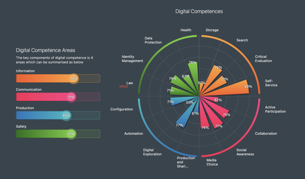 The lowest competence scores I got from Automation. This means my ability to create or modify digital solutions have space for improvement. I can agree with this result too since I’m not very familiar with different kind of automation processes. However, I feel this course has been a great development opportunity for me in this area.