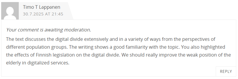 Not using digital services makes life very difficult in many ways these days, and using physical services often costs more than digitally operating self-services. Nowadays, using various KELA services, taking care of insurance and banking matters, or even selling and buying a car requires the use of digital services. Many older people certainly can rely on the help of relatives and get things done.